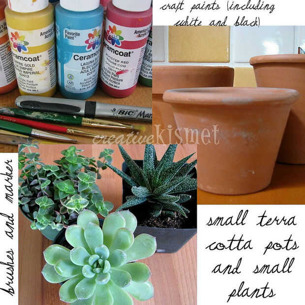 Arte pinturas acrílicas en varios colores incluyendo blanco y negro Brochas pequeñas lápiz marcadores permanentes negros macetas de terracota pequeñas crasas pequeñas o las caléndulas macetas
