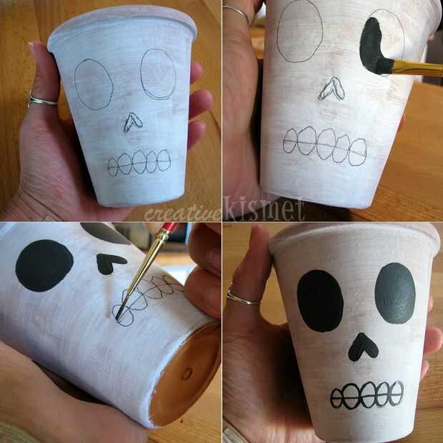 2. bosquejar hacia fuera la cara de calavera con un lápiz, como se ve en la foto de arriba, luego rellenar con pintura negra o marcador. Deja como está, o ir al siguiente paso.