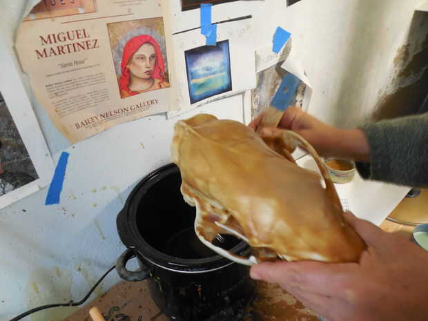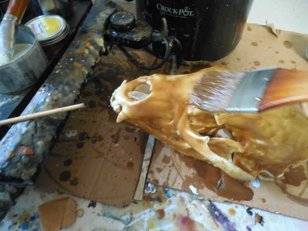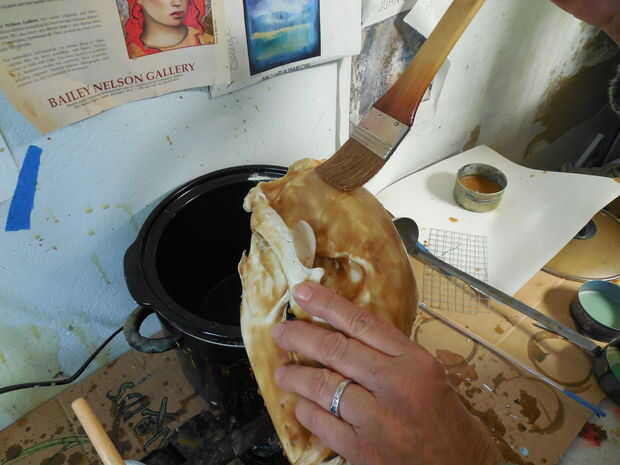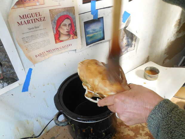 El medio encáustica es pura cera de abeja mezclada con resina de damar cruda, cera de 8 partes a 1 parte de resina. Esto se derrite juntos en una olla. Pinto de 2 o 3 capas de este medio.
