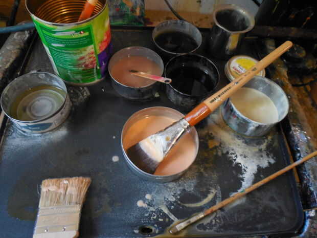 A continuación se derrite la pintura encáustica en latas en una plancha de hotcake, elijo un color carnoso para este cráneo de oso porque pintura encaustic cera de abejas es carnosa y maleable y el cráneo debe parte de la vida.