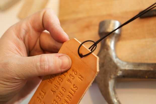 Enrolle el cordón de cuero a través del orificio para completar su etiqueta de equipaje.