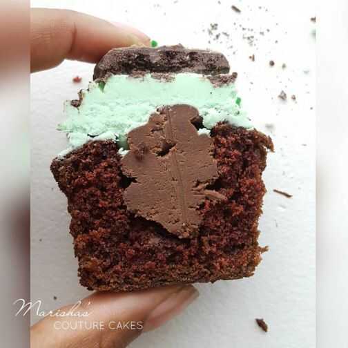 Este rico pastel de chocolate se llena con un relleno de dulce de menta y cubierto con crema de menta y una galleta de chocolate de menta. En conjunto, esto hace que la Magdalena día el perfecto San Patricio.