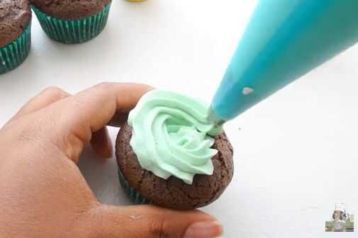 Tubo de la crema de mantequilla en un gran remolino y encima una galleta de chocolate de menta.