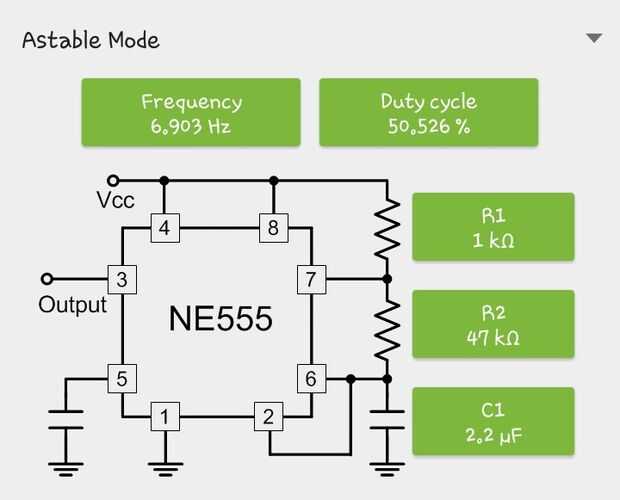 Ya que estamos usando este circuito en modo Astable y estamos utilizando R1 = 1K, R2 = 47K y C1 = 2.2uF y produce 6,903 khz de frecuencia. C1 condensador, resistor R1, R2 determina el período de oscilación. Si se aumenta el valor del condensador entonces frecuencia frecuencia disminuirá y si disminuye el valor del condensador entonces frecuencia va a aumentar. En caso de registro si se aumenta el valor de R2 entonces aquí frecuencia es también va a disminuir y si disminuye el valor de R2, entonces frecuencia va a aumentar. Si usted quiere cambiar o aumentar o disminuir el valor de R2 según su requisito, entonces se recomienda el uso de reset en lugar de R2. Le ayudará a fijar la frecuencia que desea que frecuencia es conveniente para usted.