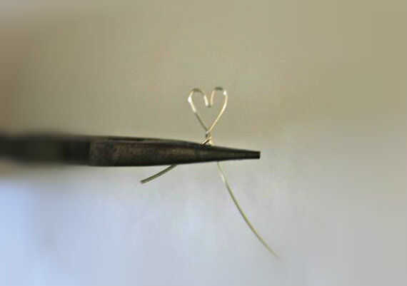 Cortar un trozo de alambre de aproximadamente tres pulgadas de largo. Comenzar por formar la parte superior del corazón con sus alicates de punta redonda. Con alicates planos, presione el punto entre las dos partes redondeadas. Luego, sujete los dos extremos del alambre firmemente y gire dos o tres veces. No corte el cable extra.