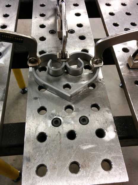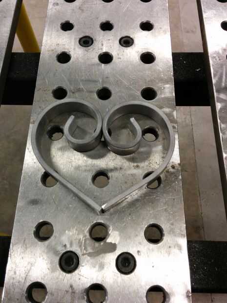 En este paso va ser soldadura el acero plano juntos.  Usé la soldadora de Mig en la TechShop hacerlo.  Tener en cuenta que los ajustes recomendados para la soldadura del acero plano espesor 3/16 de pulgada es un poco alto en el soldador de Lincoln por lo que tendrá que dar marcha atrás la tensión y la velocidad de alimentación de alambre un poco o tienes que estar limpiando sus soldaduras como tenía que.  Ajustar firmemente el material a la mesa de soldadura y lejos del fuego colocar la tachuela de soldaduras en donde se encuentran los rollos y donde se encuentra con la punta del corazón.