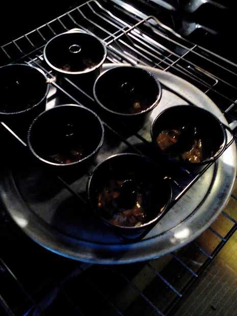 Instrucciones: Precalentar el horno a 350F. Añadir los ingredientes secos en un bol y mezclar las húmedas en otro. Con la batidora en baja, agregue lentamente los ingredientes húmedos en seco hasta casi incorporado. Volcado en las frutas y verduras y mezclar hasta que se distribuye uniformemente. Llenar cada recipiente uniformemente y cocer hasta que esté listo (unos 25 minutos, pero cada horno diferentes.) Sacar del horno y deje enfriar.