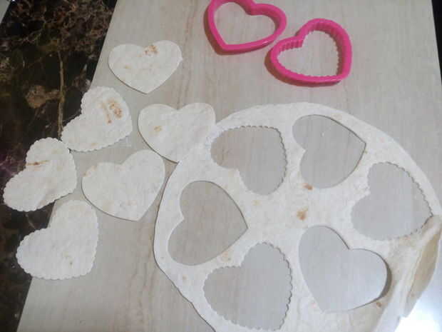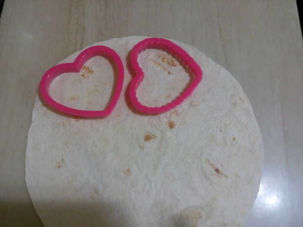 Coloque una tortilla de harina en una superficie limpia y plana. Utilice un cortador de galletas en forma de corazón corte.