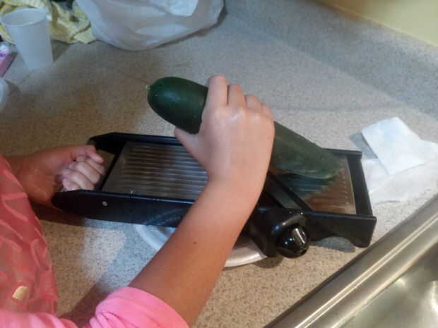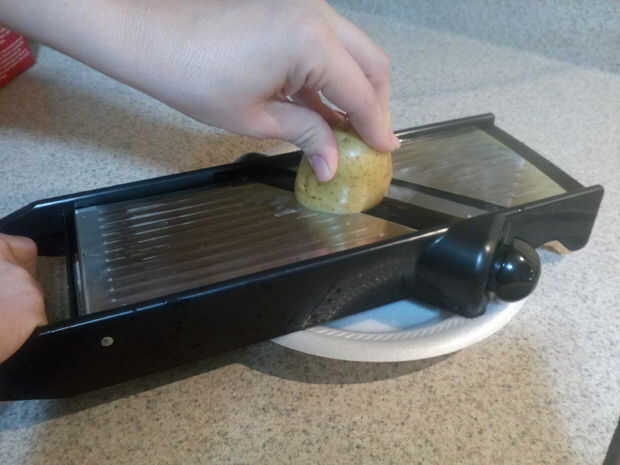 Usando una máquina de cortar vegetal o un cuchillo, cortar finamente las papas y pepinos. Apartar el pepino y colocar una capa de las rebanadas de patata en un plato de microondas seguro.