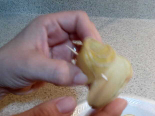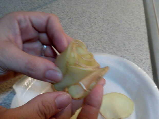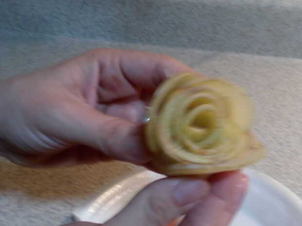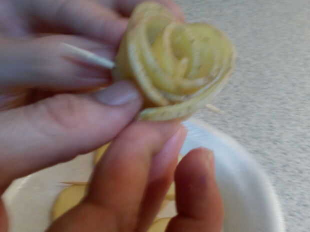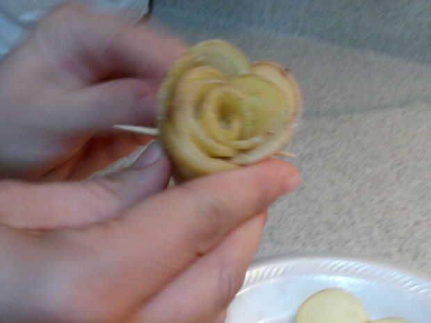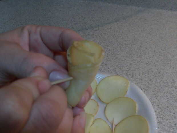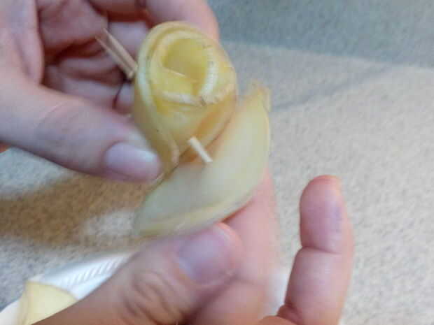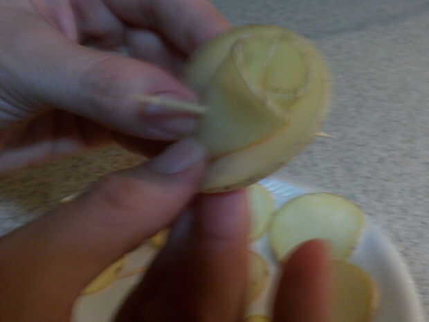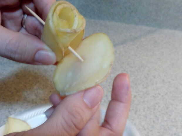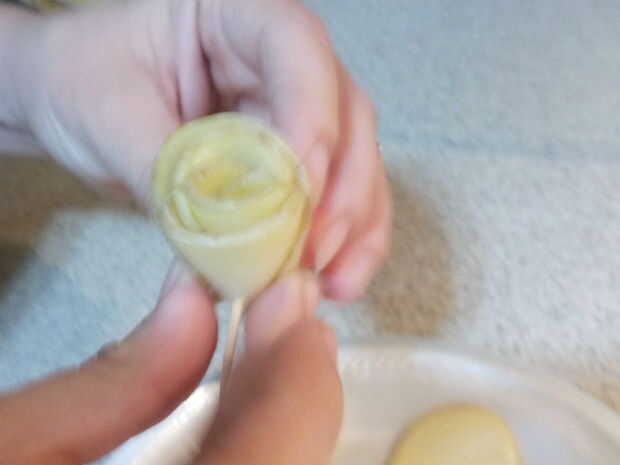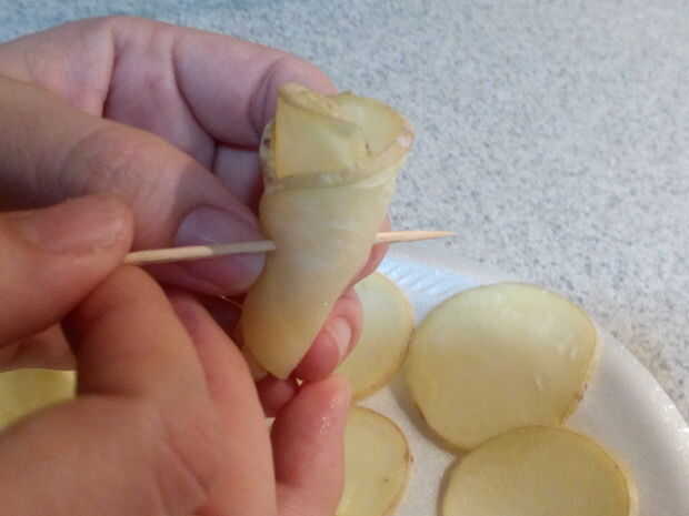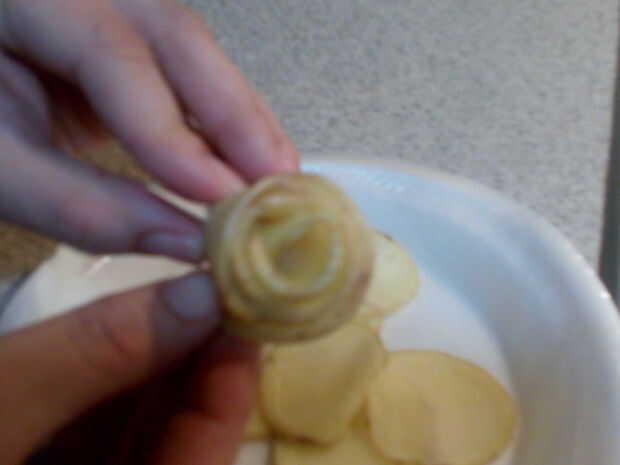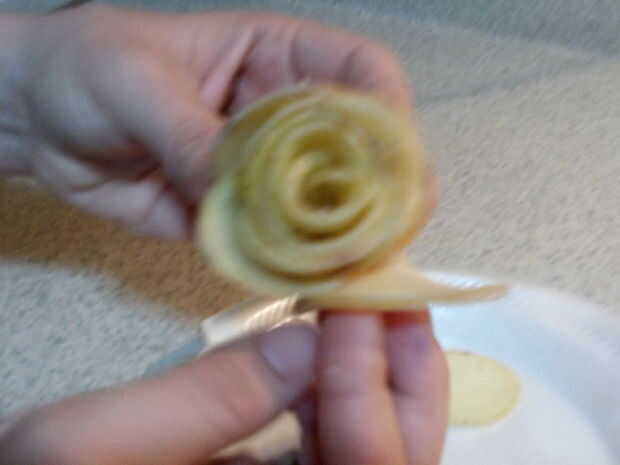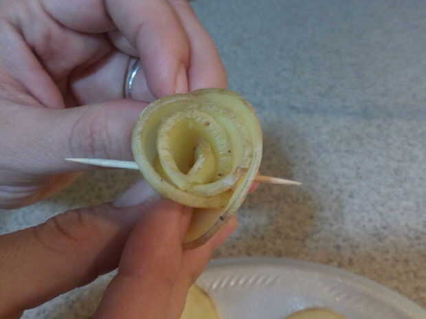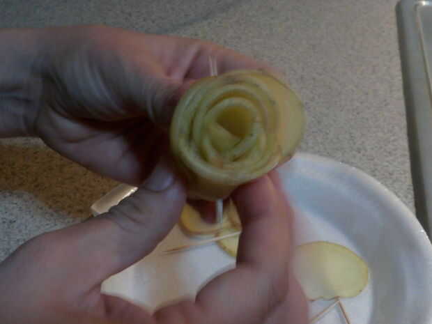 Comience doblando un trozo de patata en forma de un capullo de rosa. Coloque un palillo a través del capullo de rosa formado y continuar colocar rodajas de patata alrededor del capullo de rosa inicial. Utilice el palillo de dientes para mantener las rebanadas de patata en lugar. Continuar colocar rodajas de patata para formar la rosa completamente. Se utiliza aproximadamente una patata pequeña por rose.