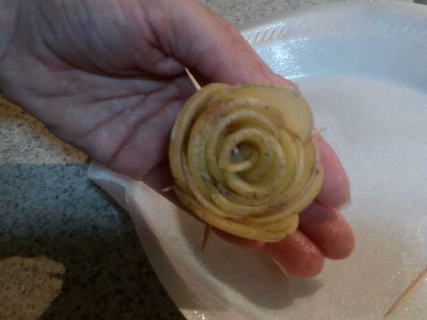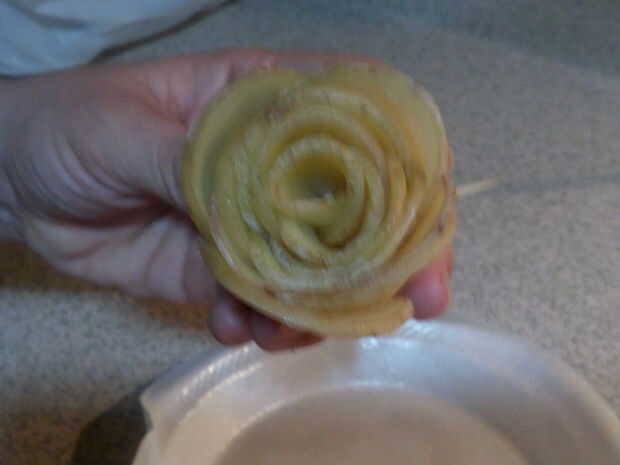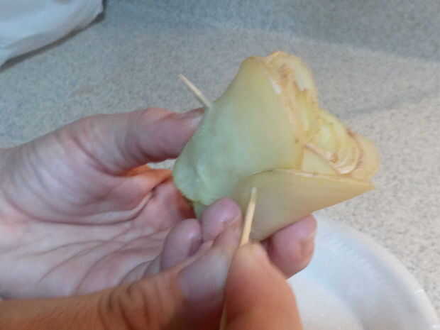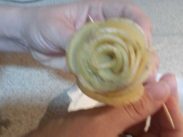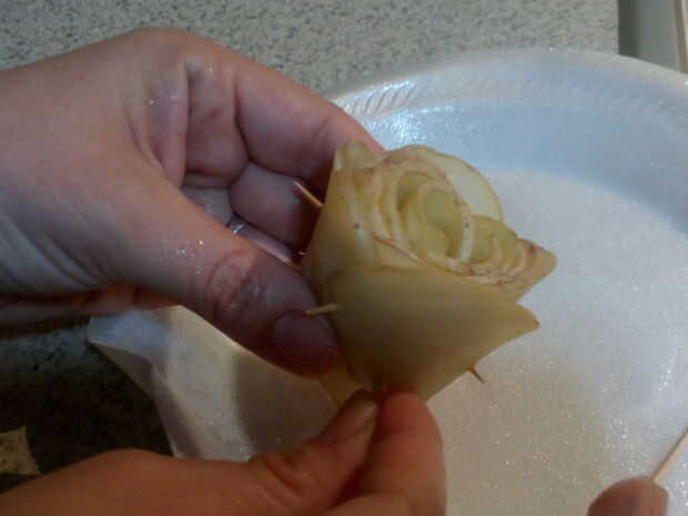 Cuando el está totalmente en forma de rosa, coloque más palillos de dientes para mantener el rosa en forma mientras que fritas. Asegure todos los palillos de dientes. Necesita 3-4 palillos por rose.
