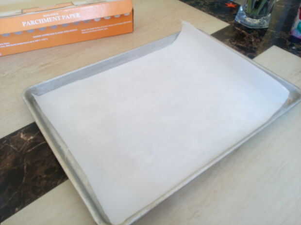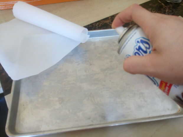 Cortar un trozo de papel de pergamino que cubre totalmente la parte inferior de la bandeja para hornear. Adición de hornear antiadherente spay voluntad el papel Ayude a permanecer en el lugar.