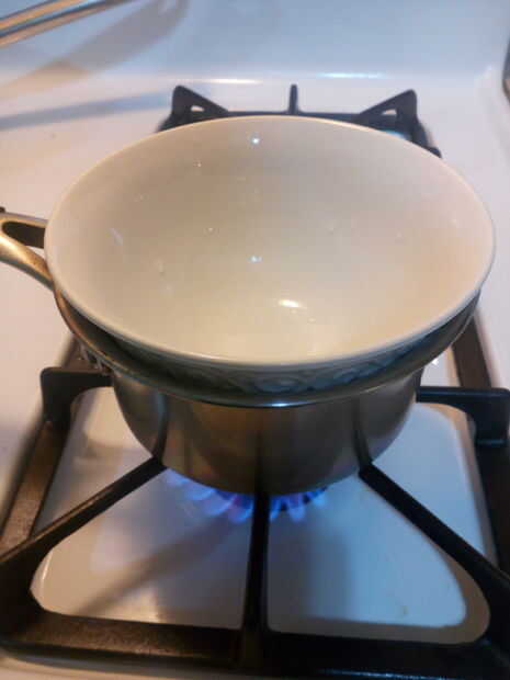 Si tienes una caldera doble o fundidor de chocolate estás de suerte, si no, es hora de ser creativo. Coloque una cacerola pequeña con agua a hervir. Utilizando un recipiente de microondas seguro, colóquelo sobre el agua hirviendo.