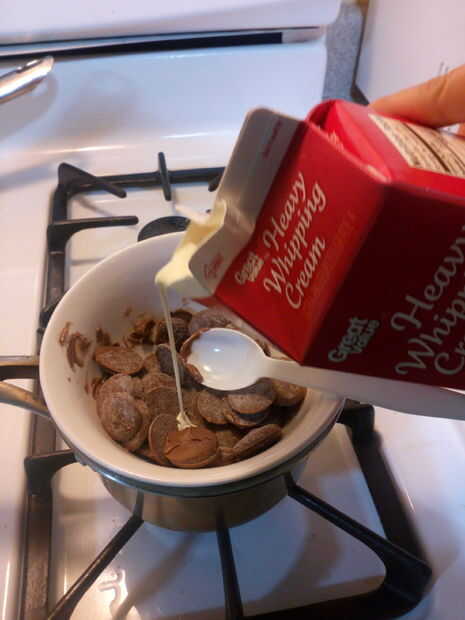 Añadir la derrite chocolate a la taza que cubre el agua hirviendo. Lentamente agregue un poco de nata, a la vez, hasta que el chocolate tenía una consistencia líquida.
