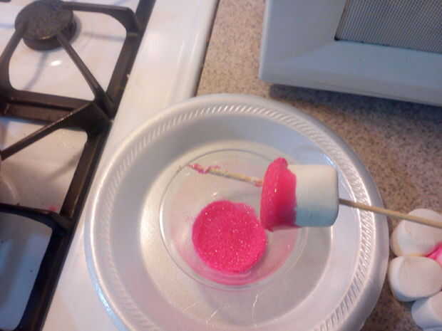 Insertar una brocheta en el malvavisco y sumergir el malvavisco en el chocolate derretido. Sacudir cualquier chocolate en exceso, entonces, inmediatamente sumerja el extremo con chocolate en los cristales de azúcar. Baje el malvavisco con suficiente espacio insertar una fresa.
