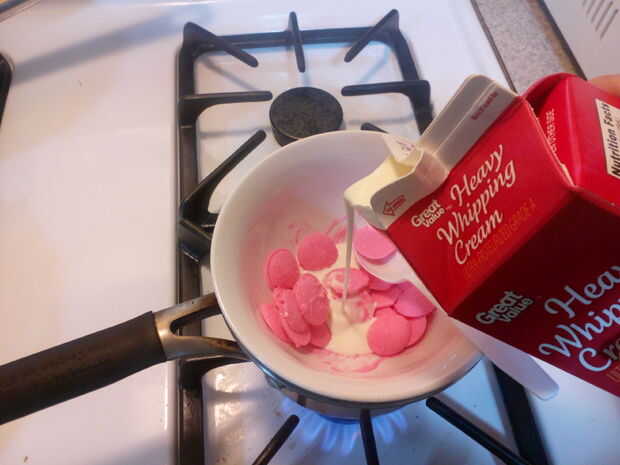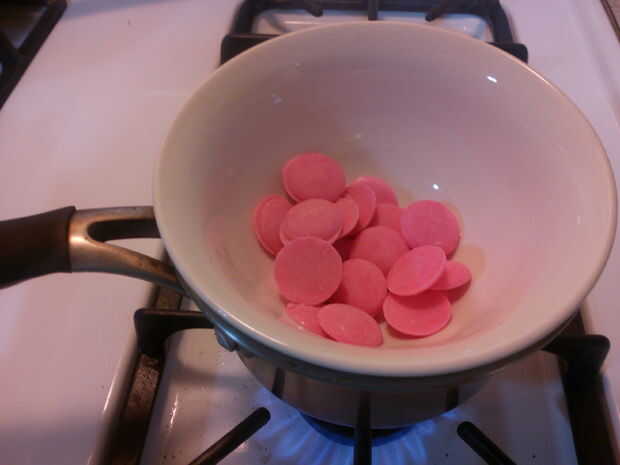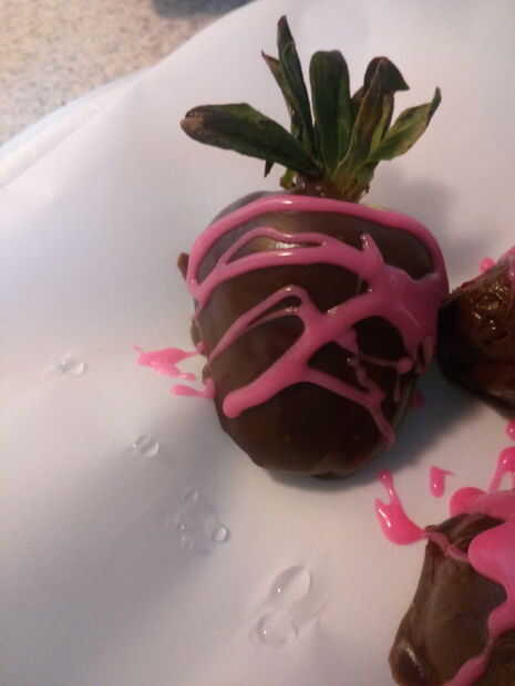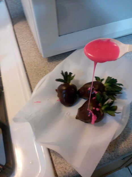 Derretimiento derretimientos de chocolate rosa o rojo y viertan un poco de chocolate sobre las fresas cubiertas chocolate ya.