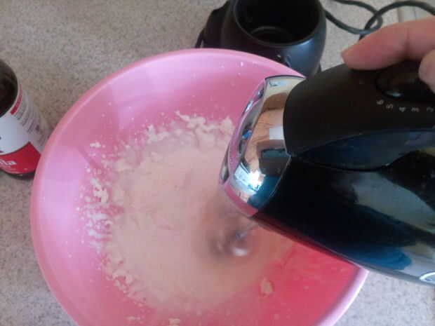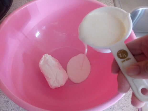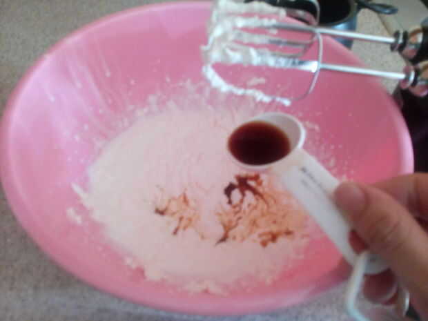 Batir 4 onzas de queso crema y 1/2 una taza de crema de leche en un tazón. En otro tazón combinar 1 cucharada de extracto de vainilla, 1 taza de crema de leche y 1/3 taza azúcar turrón. Añadir lentamente la mezcla de queso crema a la mezcla con el azúcar glas. Puede Agregar una pequeña gota de colorante para la estética.