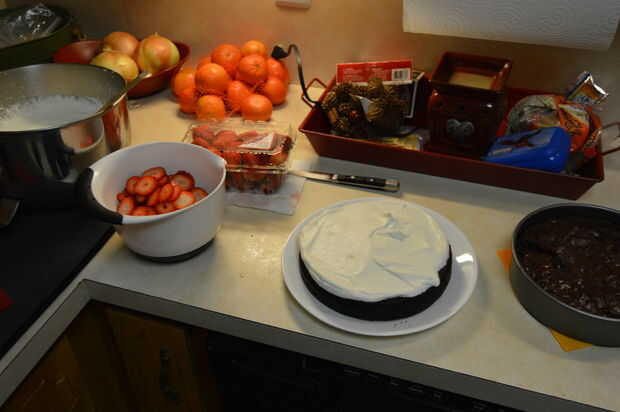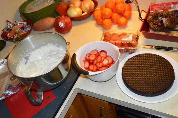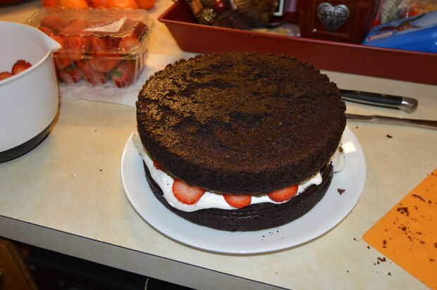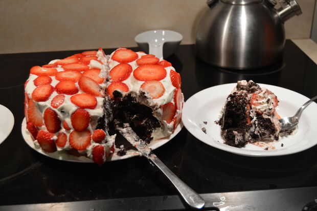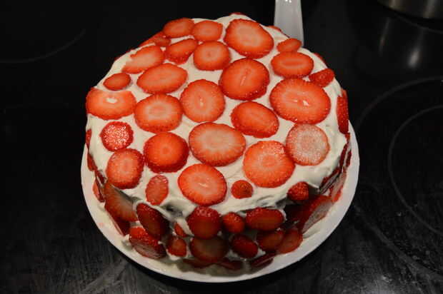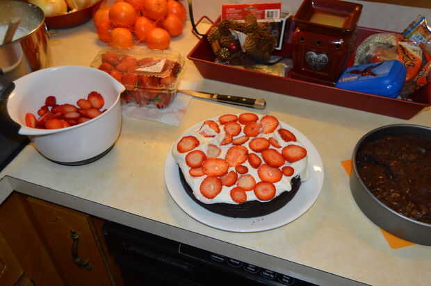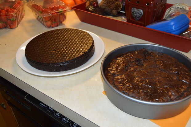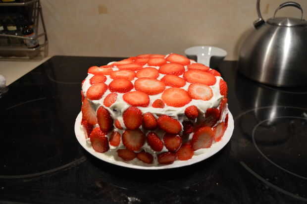 Primero corte las fresas en rodajas finas y colocarlas en un bol. A continuación capa de una capa de crema de látigo sobre el brownie de fondo. Luego aplicar las rodajas de fresa a la capa de látigo crema hasta cubrir completamente. A continuación agregar la segunda capa de brownie y capa con una capa de crema de látigo en todas partes una vez finalizada añadir rebanadas de fresa hasta que se cubra totalmente.