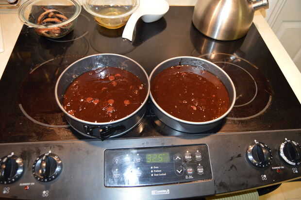 Yo uso dos mezclas de brownie de chocolate oscuro de Ghirardelli. Una mezcla para cada bandeja circular de 9 pulgadas. Después de mezclar Coloque la mezcla en los moldes ligeramente engrasados y hornear hasta que los brownies estén en su punto de cocción deseado. Me gusta que sean un poco hecho y pegajosa :) Retirar los brownies y apartar en un plato.
