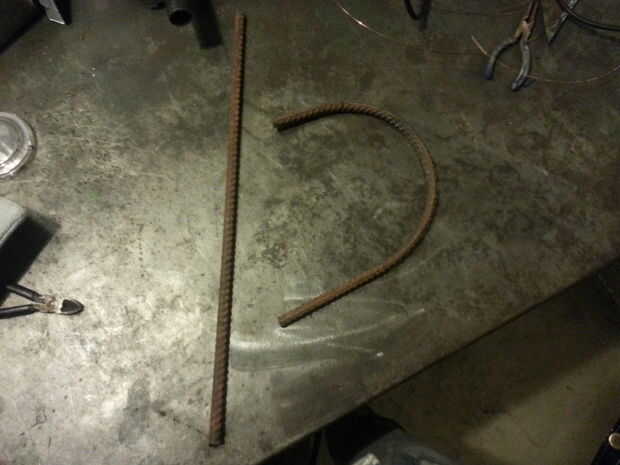 Usé dos tubos de 4' para este proceso. En primer lugar, necesitamos la medida de la varilla a la plantilla y marcar de donde tenemos que empezar a doblar con un rotulador. Luego, le coloque uno de los tubos en el suelo e Inserte la varilla en el tubo hasta la marca sharpie. Luego coloque el otro tubo en el otro extremo de la varilla, cerca de seis pulgadas de la marca sharpie. Jale hacia arriba el tubo para hacer la curva. Rebar es bastante maldito denso metal y es muy difícil de doblar. Utilizando los dos tubos le da el poder para hacer las curvas difíciles con más facilidad.