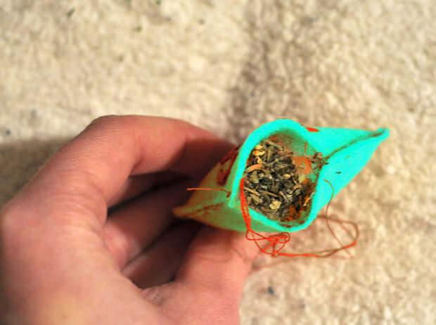 3. una vez que haya terminado el bordado, coser los bordes con los lados del derecho juntos, dejando una pequeña área abierta donde usted puede dar vuelta hacia fuera y cosas del corazón. Cosas rellenando un poco y luego algunos catnip. Superior con un poco de relleno más para que no caiga el catnip. Cerrar el resto del borde cuando termine de llenar.