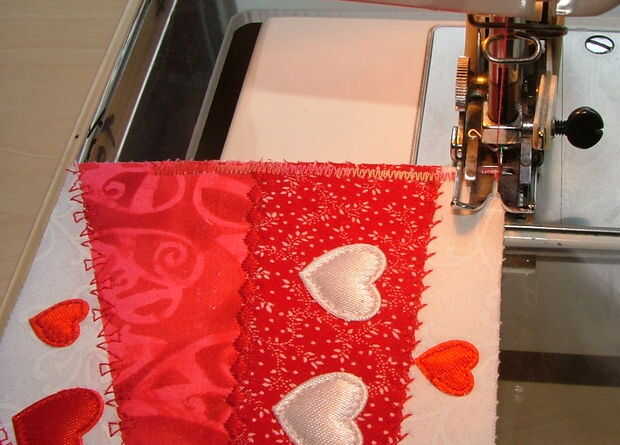 Usar mi máquina de coser con un hilo de color en la bobina y el hilo blanco en la aguja, pero podría utilizar el mismo hilo en los dos si quieres. Coser con el lado blanco de plan - de esta manera usted puede ver donde sus adornos son y evitan y no quedar atrapados en los alimentadores.
