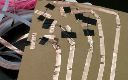 Cortar pequeñas secciones de la cinta de cobre y colocar debajo de las patas positivas de los leds. Asegúrese que el lado brillante de la cinta de cobre es tocando las piernas de los leds. Usted puede querer hacer estos contactos un poco más grande que hice en esta imagen.