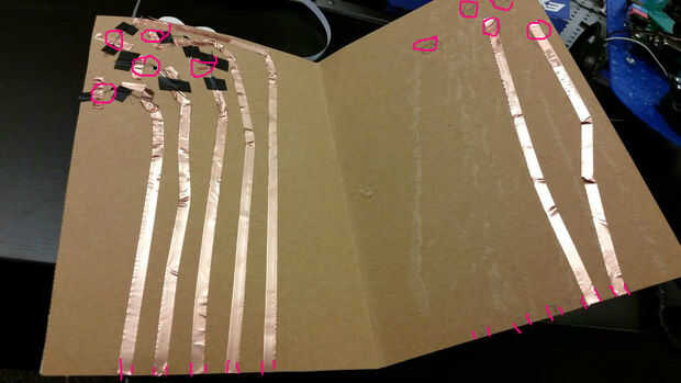 Doble la tarjeta cerrada y marque la ubicación de los contactos que acaba de hacer en el otro lado de la tarjeta. También la marca donde la cinta de cobre toque la parte inferior de la tarjeta.