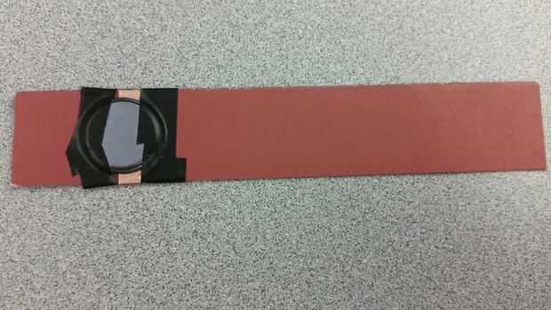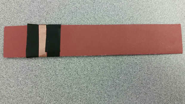 Cortar una tira de papel más rígido ligeramente más largo que el ancho de la tarjeta. Envuelva una tira de cinta de cobre alrededor de la pestaña y asegurar la batería en la parte superior con cinta aislante. Escribir mi batería con el lado positivo para que la cinta de cobre en el otro lado será positiva.