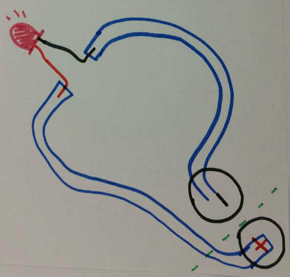 La dos primeras imagen muestra el circuito básico que hablé en el paso anterior, se llevará a cabo en circuitos de papel. Te sugiero altamente dibujo el circuito antes de que pone realmente abajo de la cinta de cobre por lo que puede asegurarse de que la colocación es correcta. En estas imágenes la cinta de cobre se representa por el marcador azul. Note que los lados positivos (rojos) están conectados por cinta de cobre y el negativo (negro) lados son conectados por cinta de cobre.