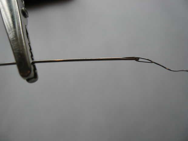 Enrosque el alambre de acero inoxidable sobre una aguja de coser ordinaria y cose un hilo principal hasta la parte superior en el lado izquierdo. El segundo cable maestro necesita ir sólo a medio camino para arriba y va más cerca a los LEDs que la primera. De esa manera no necesitamos nunca tenemos los cables de LED cruce el cable principal.