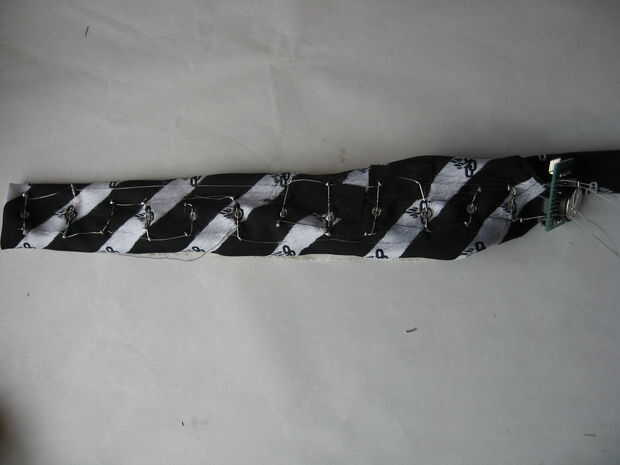 Como aislamiento, usé un par de pequeños trozos de hierro-en remiendo tejido. Como se puede ver en la segunda foto, esto aísla los dos cables de esclavos más cercanos de LEDs 6 y 7, lo que les permite saltar más para auxiliar 1 en el exterior. Como segunda pieza de la tela hace lo mismo para que puedan alcanzar los 8 LEDs y 9 esclavo 2 sin cortocircuito en esclavo 3.