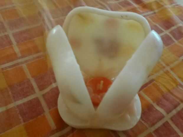 Montar las cáscaras en la base y mantenerlos firmemente sobre la base. Con una cuchara pequeña, vierta poca cantidad de cera fundida a la base de las cáscaras. Vierta cera un poco en los lados de las cáscaras que se tocan y dejan enfriar.