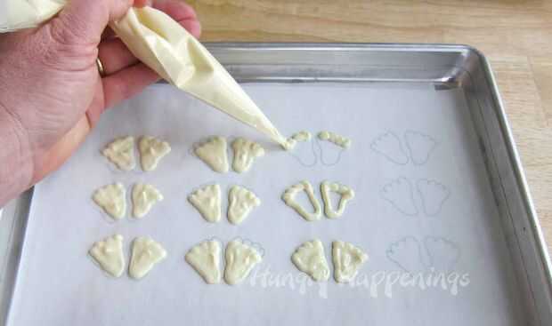 Haga clic aquí para descargar la plantilla de pies borroso caliente. Imprimir plantilla. Establecer la plantilla de pies borroso caliente impresa en una hoja de papel sulfurizado sobre una bandeja para hornear. Pies de tubo con recubrimiento confitería blanco/del caramelo se derrite.