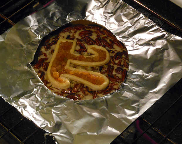 2. Vierta el relleno en la pasta quebrada horneada de par. Hornear a 375F hasta que el centro se zangolotean pero comienza a fijar, aproximadamente 25-30 minutos. En este punto, con cuidado coloque la Tartaleta de pi con pasas de uva en el centro del pastel y hornear durante otros 15 minutos. En el caso de que la corteza comienza a conseguir demasiado doradas, colocar un recorte de papel de aluminio para proteger la corteza de la quema.