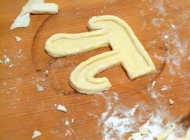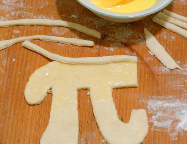 3. usando un cuchillo afilado, cortar largo tiras de masa de pastelería cada medición! 1/4 de espesor. Ligeramente cepille el huevo en el corte símbolo pi y coloque con cuidado las tiras a lo largo del borde. Continuar por el borde del símbolo hasta que está completamente rodeado.