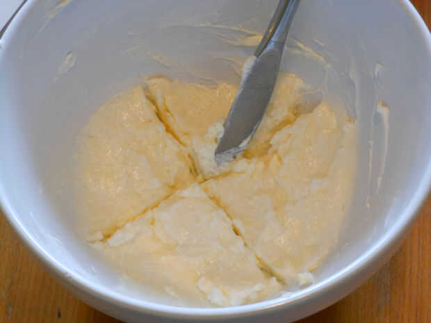 1. en un tazón, combine la mantequilla y manteca hasta homogeneizada. Usando un cuchillo, dividir esta grasa mezcla en cuatro porciones iguales.