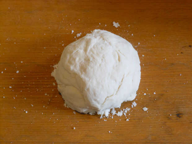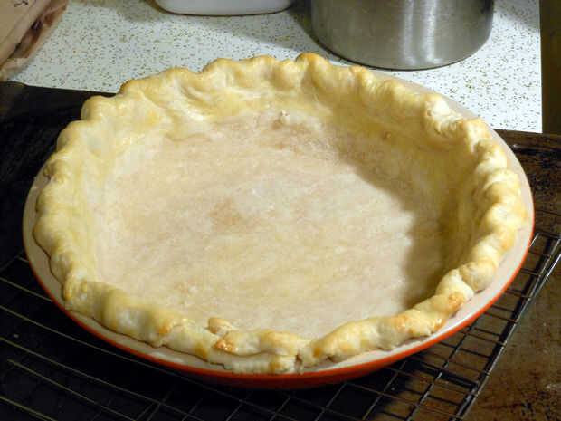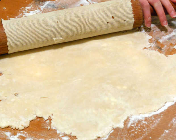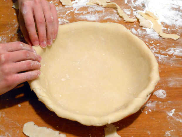 5. después de 30 min, estirar a 1/4 de espesor y colocar en un 9 en el plato de pastel redondo. Recorte cualquier exceso sobresaliente repostería y doblar los bordes entre dos nudillos.