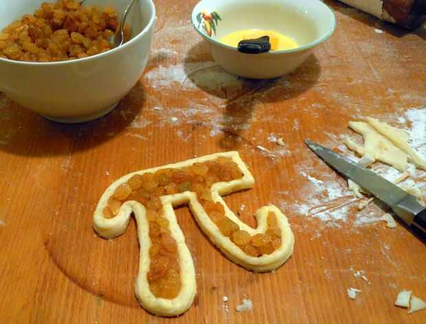 5. con cuidado coloque las pasas en el centro de la masa del símbolo pi.