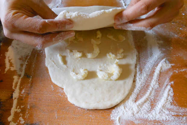 4. Presione hacia abajo los bordes de la masa para sellar la grasa. Rodillo en otra tira larga y con este procedimiento hasta que toda la grasa se utiliza para arriba. pliegan en envoltura de plástico y dejar enfriar en la nevera durante al menos 30 minutos.
