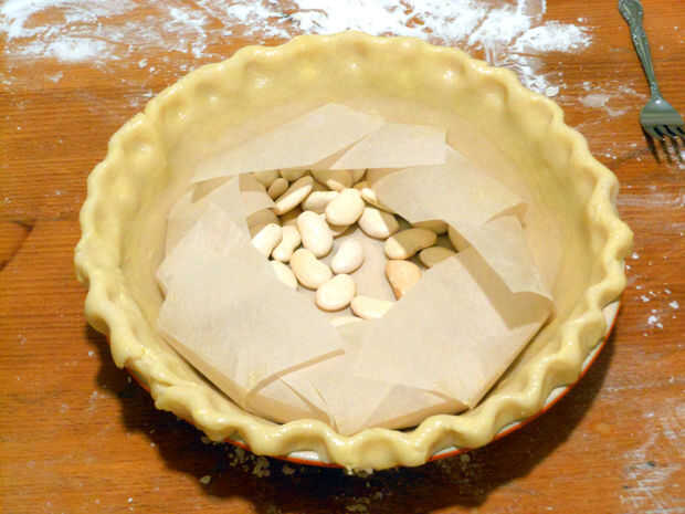 6. la parte inferior del muelle y coloque un pedazo de papel pergamino dentro con frijoles secos a peso la masa. Cepillo con un lavado de huevo en este momento. Ciego Hornee a 450F por 15 min. Después de 15 minutos, sacar del horno y deje enfriar.