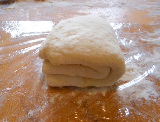 3. extienda esta masa de hojaldre en una tira de unos 2 o 3-fold mientras es amplia. Punto de un cuarto de la grasa sobre la superficie de la masa. Doblar la parte inferior 1/3 de la masa sobre 2/3 de la masa y luego doblar el restante 1/3 sobre esto; imaginar cómo sería doblar una carta antes de pegarse en un envolvente o cómo un promocional doblar un folleto.
