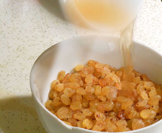 4. en un tazón pequeño, mezclar las pasas de uva, jarabe de arce y Ron. Microondas por 30 segundos, retire y mezcla. Microondas por intervalos de 30 segundos hasta que se absorba la mayor parte del líquido y las pasas son regordetas.