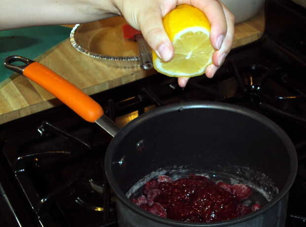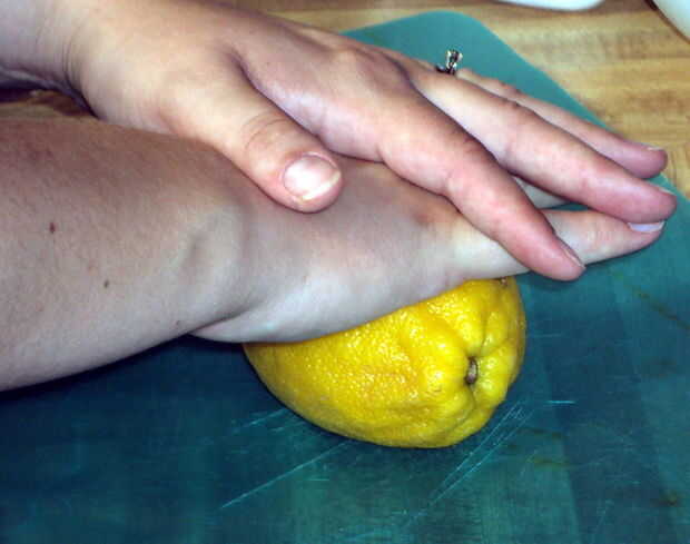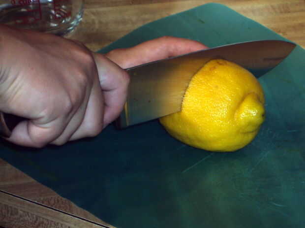 Conseguir un buen agarre en la mitad del limón es que vas a utilizar y darle un buen apretón. Si desea puede utilizar el medidor para asegurarse de que obtener exactamente dos cucharaditas, pero te digo la verdad, acabo de sacar el jugo de limón sobre la cacerola y llamar un día. Esto no es una ciencia exacta.