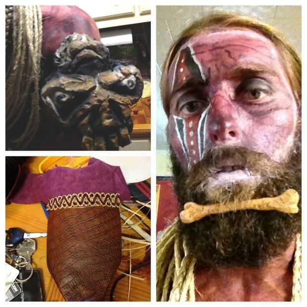 este cráneo fue hecho como armadura extra para el hombro. y la pieza a continuación fue hecha para mi muñeca para que sea un poco más completo. mi cuerpo todo pintado púrpura e hicieran pintar algunos tribales como cara. todos usando pinturas acrílicas.