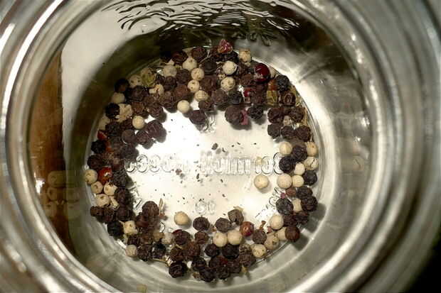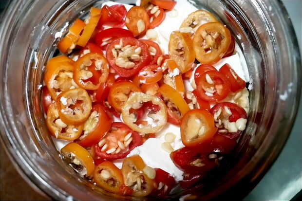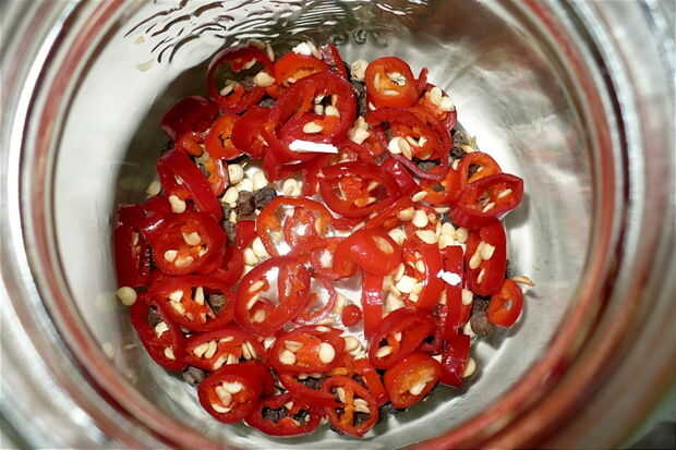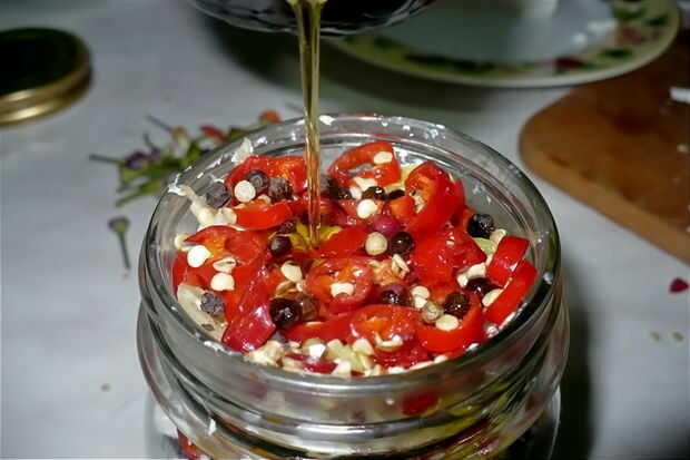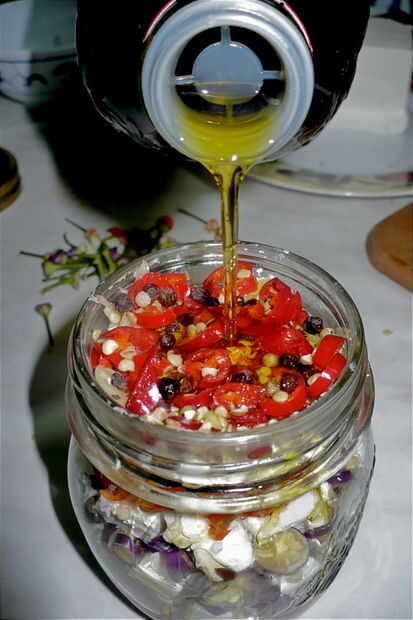 Cuando la jarra esté llena pone unas semillas de pimienta más y vierta el aceite de oliva hasta cubrir todo.