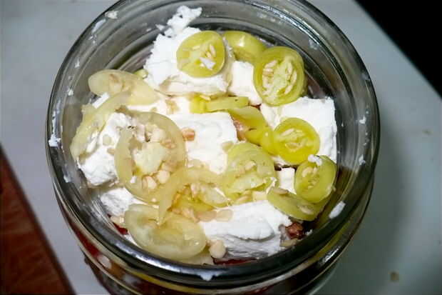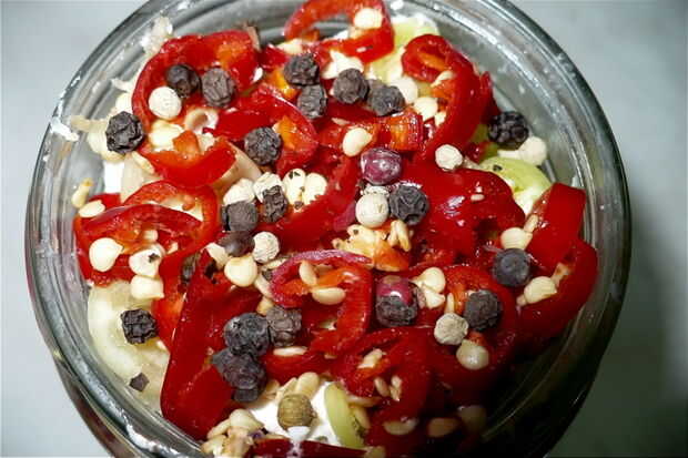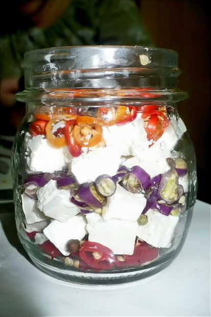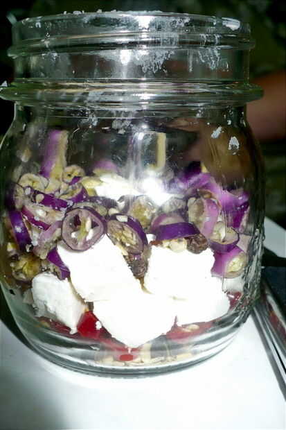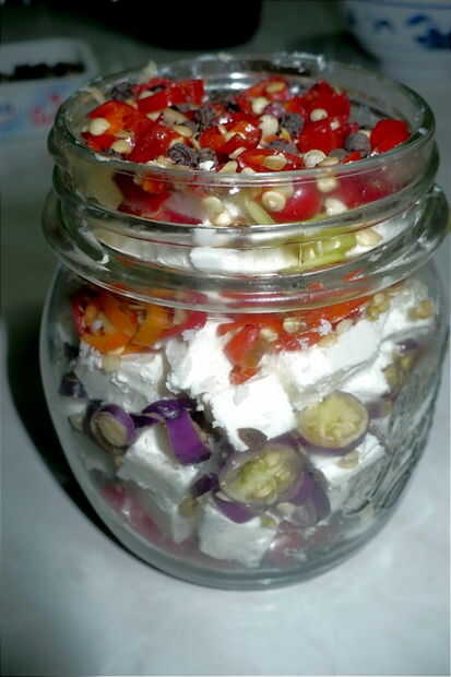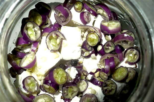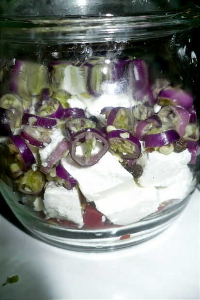 A continuación poner una capa de pimientos cortados. Como veis he empezado con los rojos. Quería conseguir un efecto fresco. Después de esto añada una capa de queso feta y otra capa de pimientos. Esta vez he puesto las púrpuras. Continúe haciendo esto hasta que haya llenado el frasco.