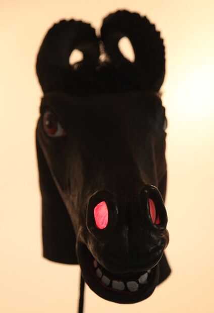 El largo hocico de la máscara de caballo viene bien aquí, simplemente empujas el grifo de luz en el cuello de botella del hocico y conducto de cinta adhesiva en el lugar desde el interior. (Sin cinta, tiende a encajan allí muy bien, como se ha visto claramente a través de las fosas nasales que ahora emiten un resplandor infernal, rojo.)