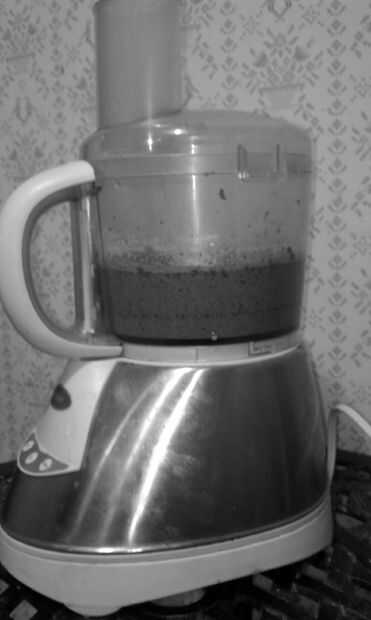 • Combinar granos, mantequilla, vainilla, chocolate, cacao en polvo, condimentos, polvo de hornear, bicarbonato de sodio, azúcar, agua en procesador de alimentos, mezclar hasta que quede suave.