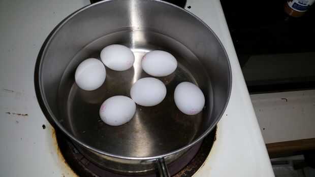 Suavemente Coloque seis huevos en suficiente agua hirviendo para cubrirlas. Hervir durante unos cinco minutos y luego enjuague con agua fría bajo el grifo.